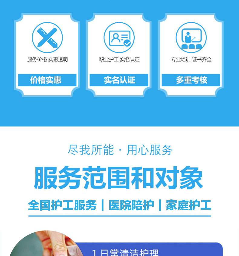 全国医院护工服务,以最优质的护工团队打造专业医院病人陪护平台,低廉透明的24小时护工收费标准,让您在工作之余可以给亲人最好的医疗陪护。