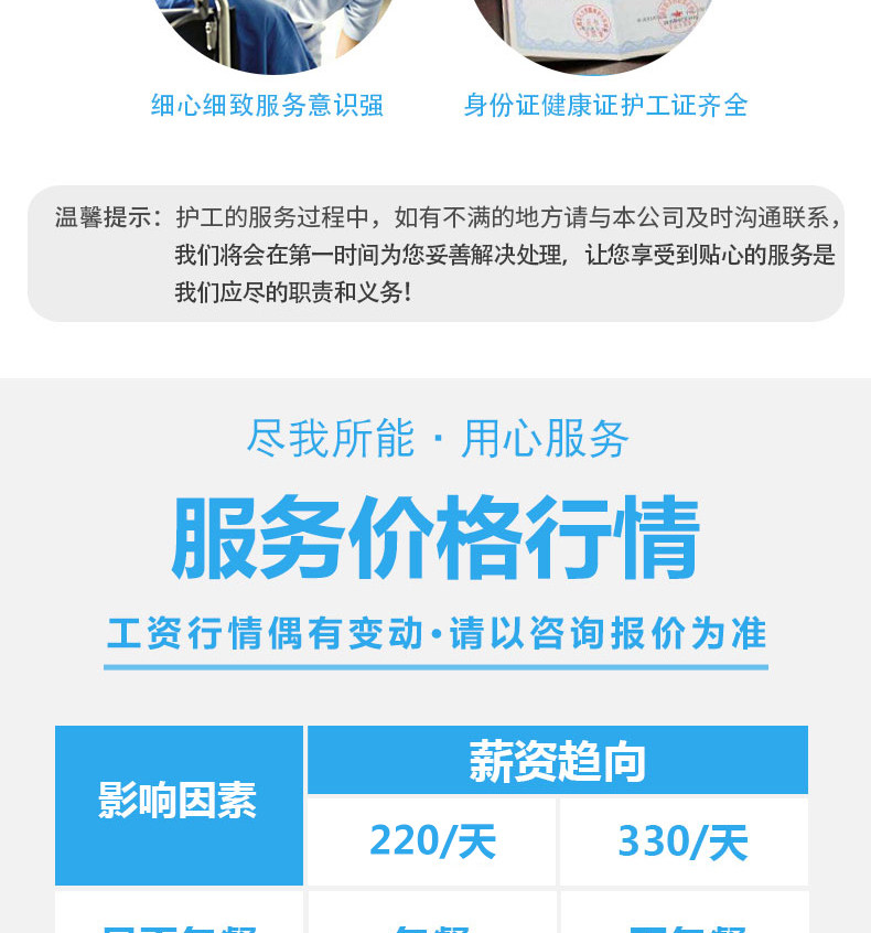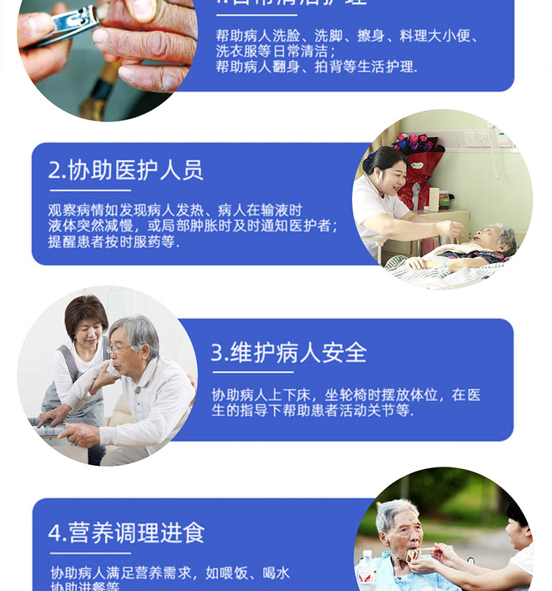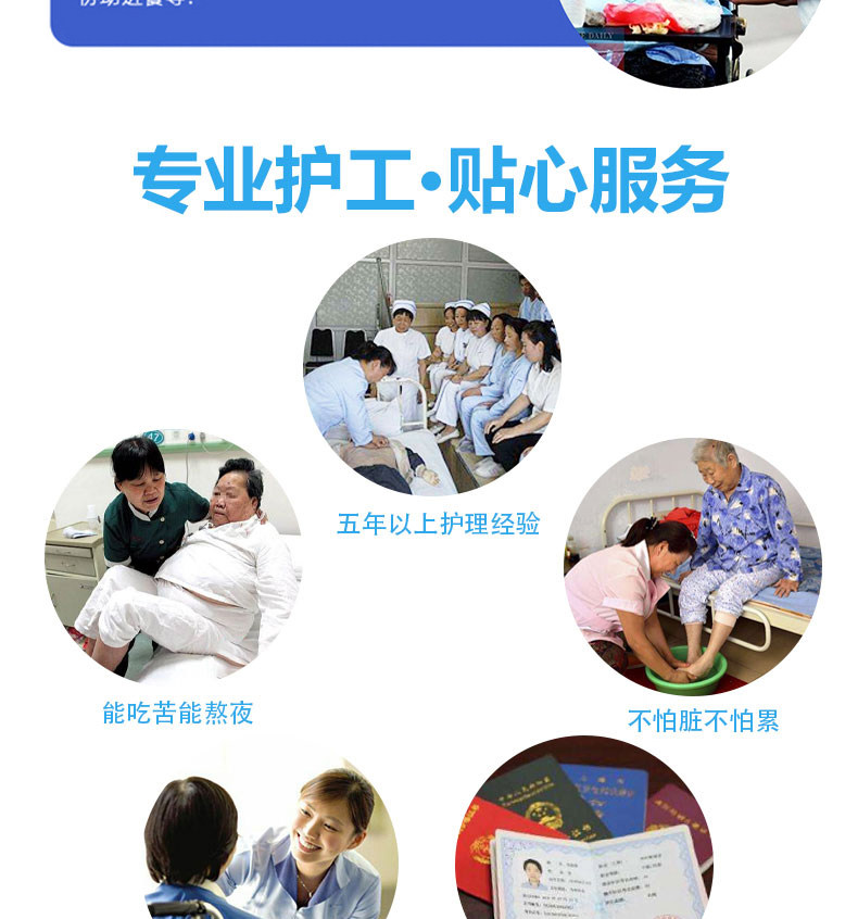 男护工:男护工在体力上明显优于女护工,适合卧床病人陪护,同时可协助病人完成功能锻炼,加快病情康复!