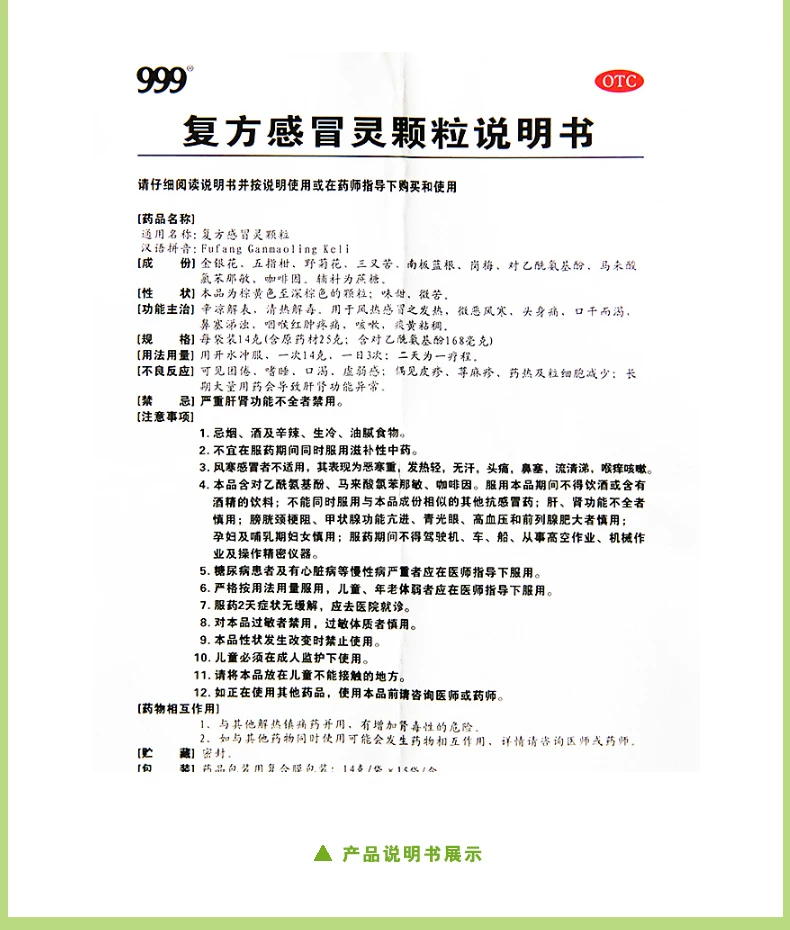 4.本品含对乙酰氨基酚、马来酸氯苯那敏、咖啡因。服用本品期间不得饮酒或含有酒精的饮料;不能同时服用与本品成份相似的其他抗感冒药;肝、肾功能不全者慎用;膀胱颈梗阻、甲状腺功能亢进、青光眼、高血压和前列腺肥大者慎用;孕妇及哺乳期妇女慎用;服药期间不得驾驶机、车、船、从事高空作业、机械作业及操作精密仪器。