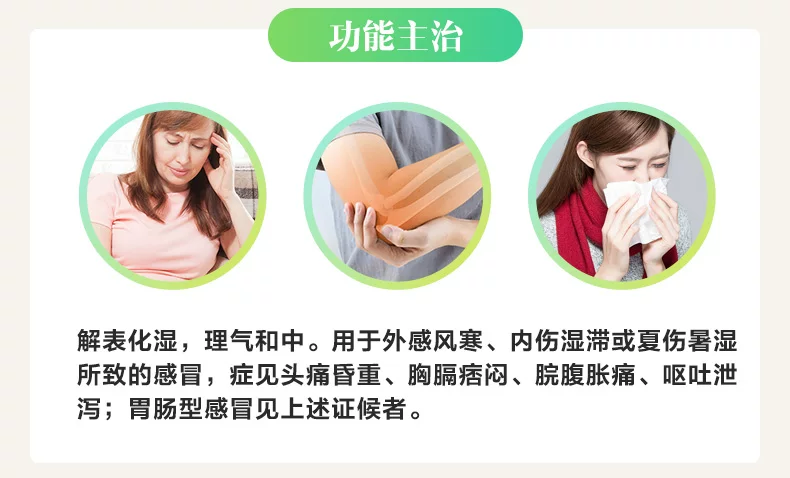 【功能主治】解表化湿,理气和中。用于外感风寒、内伤湿滞或夏伤暑湿所致的感冒,症见头痛昏重,胸膈痞闷,脘腹胀痛,呕吐泄泻;胃肠型感冒见上述证候者。