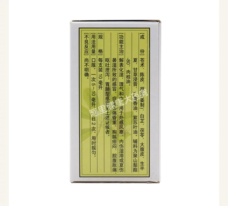 【药品成分】苍术、陈皮、厚朴(姜制)、白芷、茯苓、大腹皮、生半夏、甘草浸膏、广藿香油、紫苏叶油。辅料为聚山梨酯-80,肉桂油。