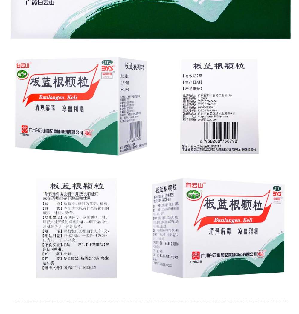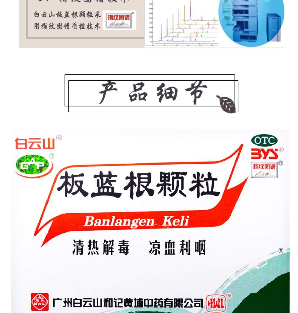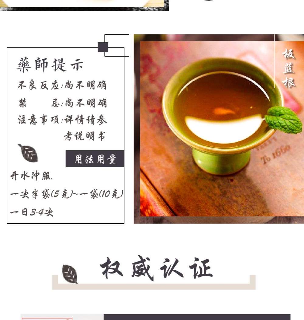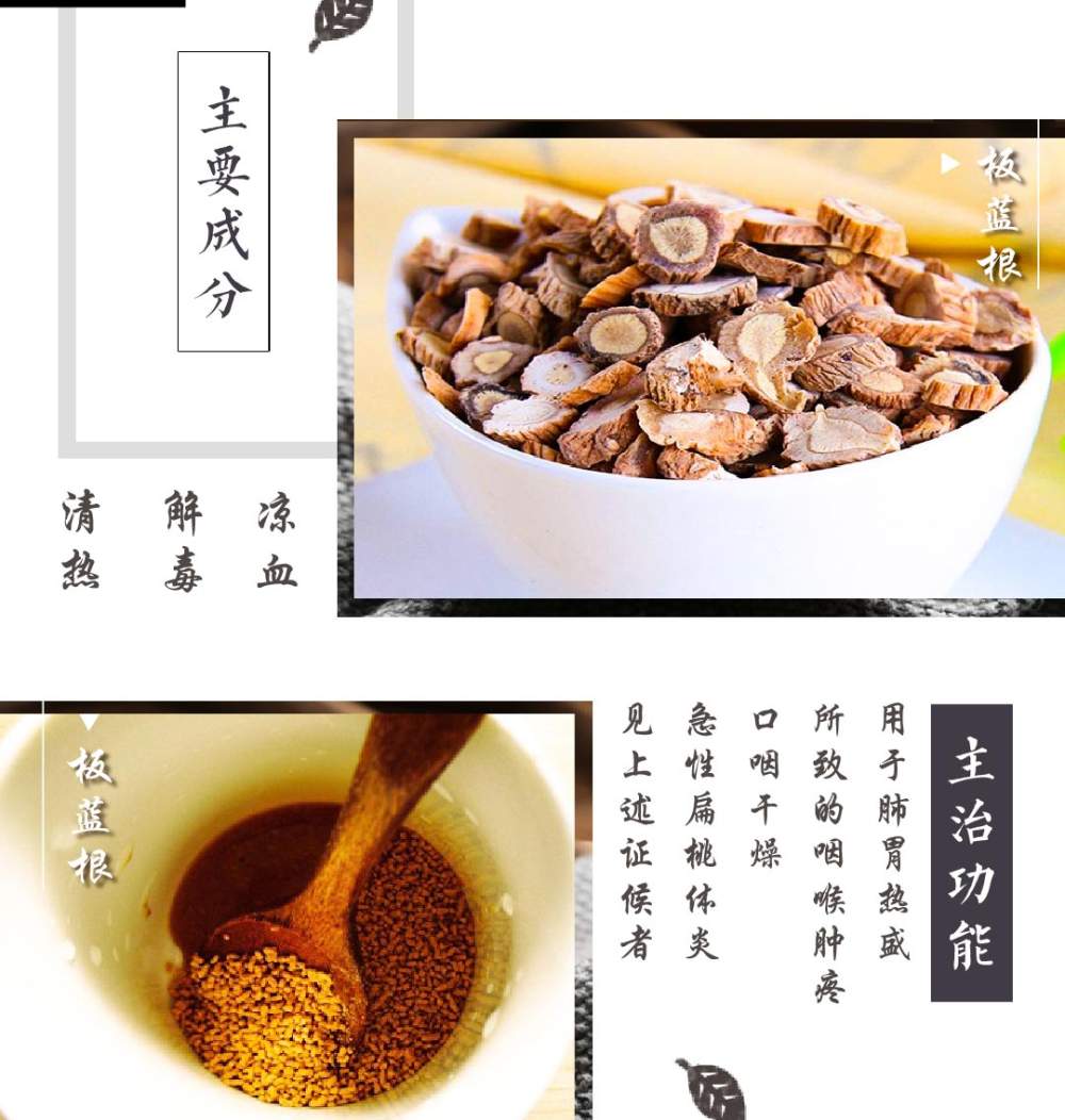【药品成分】板蓝根。辅料为蔗糖、糊精。