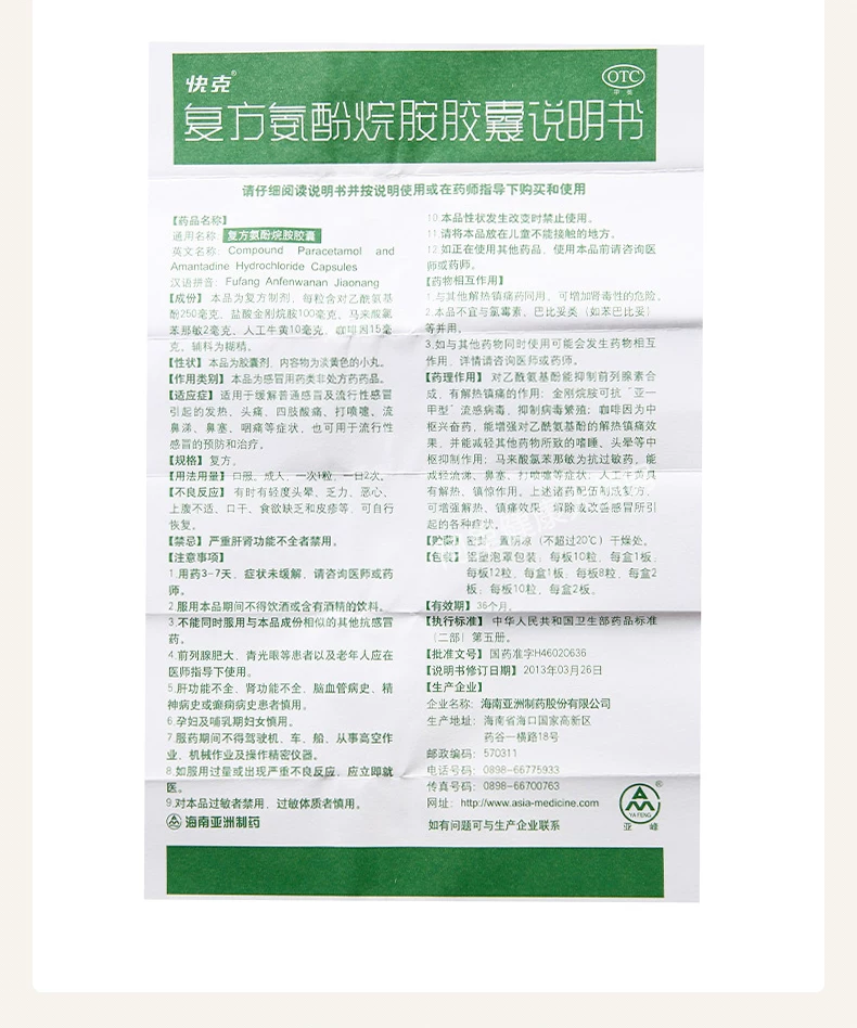 【主要成份】 本品为复方制剂。每粒含对乙酰氨基酚250mg,盐酸金刚烷胺100mg、马来酸氯苯那敏2mg、人工牛黄10mg、咖啡因15mg。辅料为糊精。