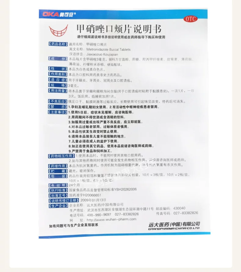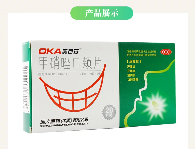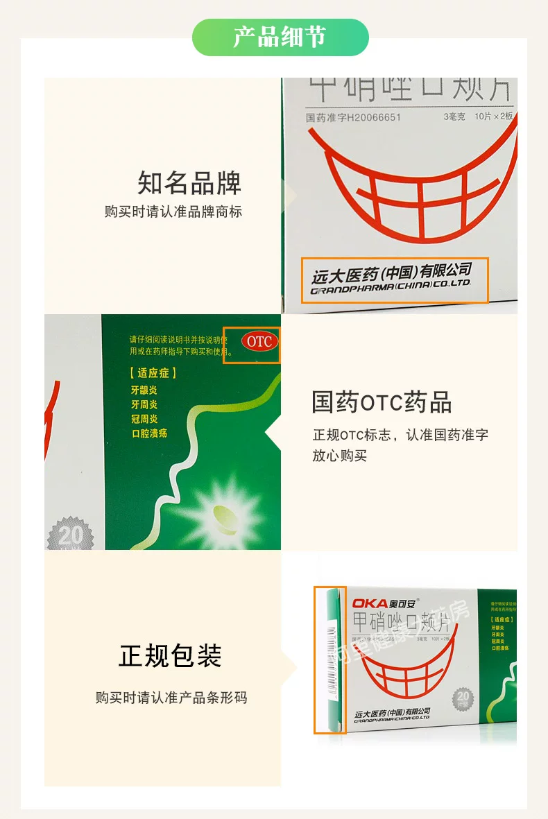 甲硝唑口颊片,用于牙龈炎、牙周炎、冠周炎及口腔溃疡。