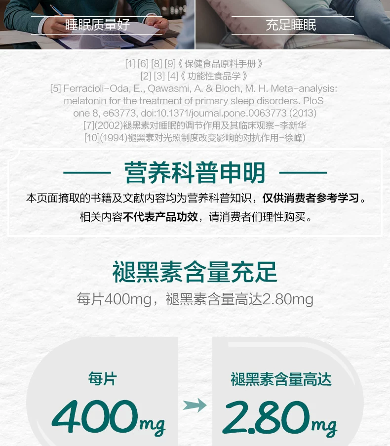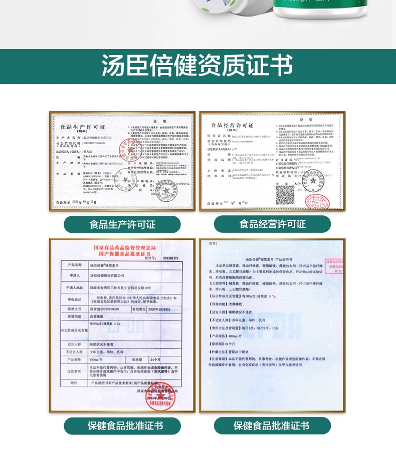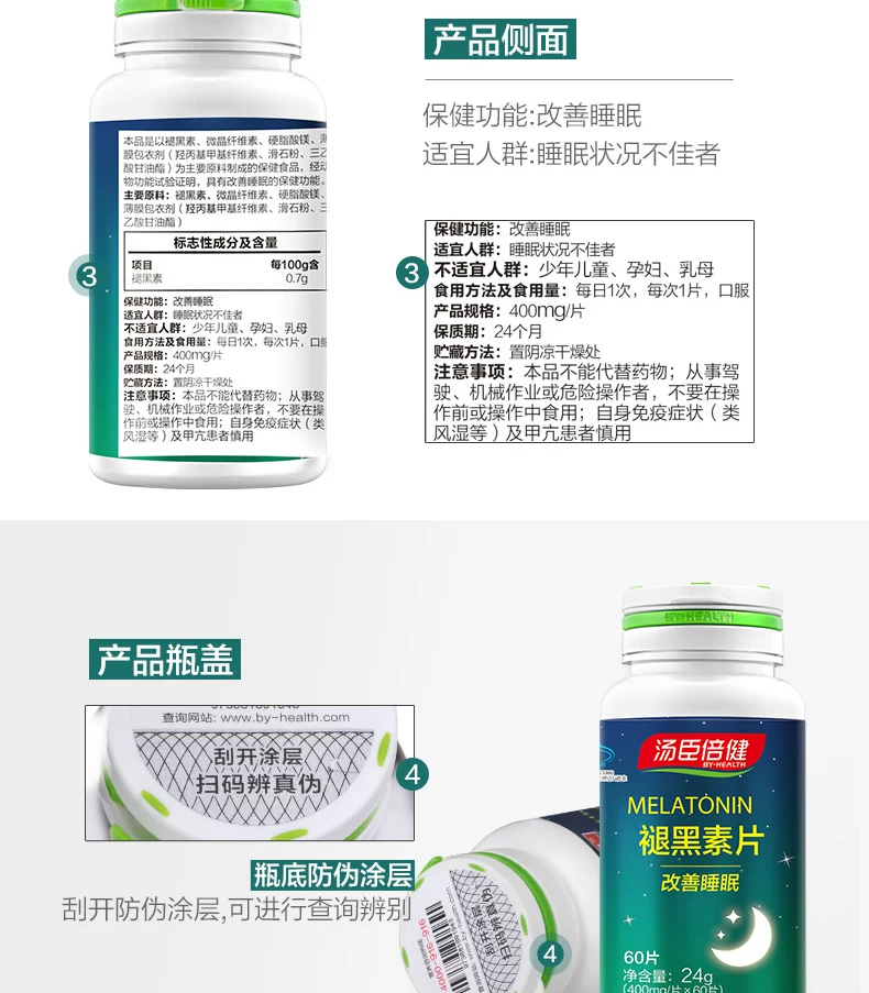 - 主要原料:褪黑素、微晶纤维素、硬脂酸镁、薄膜包衣剂(羟丙基甲基纤维素、滑石粉、三乙酸甘油酯)