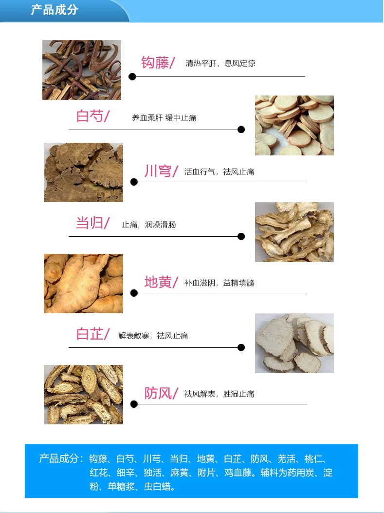 钩藤、白芍、川芎、当归、地黄、白芷、防风、羌活、桃仁、红花、细辛、独活、麻黄、附片、鸡血藤。辅料为药用炭、淀粉、单糖浆、虫白蜡。
