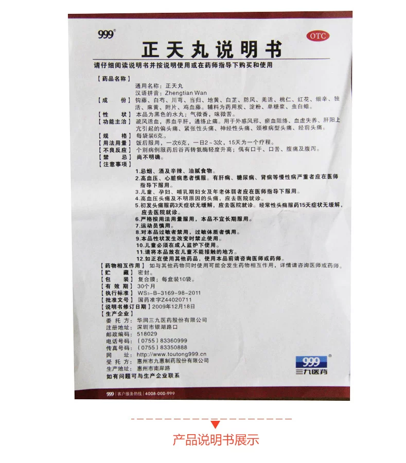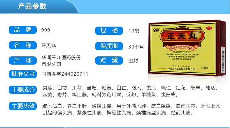 正天丸,疏风活血,养血平肝,通络止痛。用于外感风邪、瘀血阻络、血虚失养、肝阳上亢引起的偏 头痛、紧张性头痛、神经性头痛、颈椎病型头痛、经前头痛。