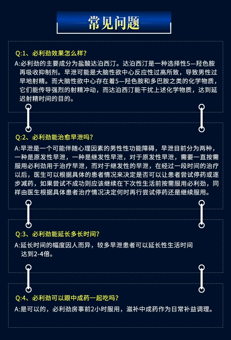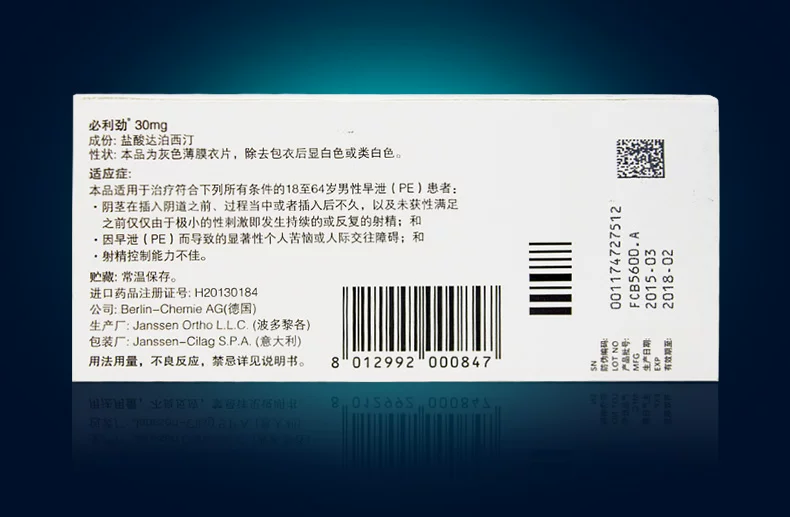 必利劲(化学名:盐酸达泊西汀),是针对早泄(PE)研发的药物,也是获得国家食品药品监督管理局(CFDA)批准的早泄(PE)适应症的治疗药物。