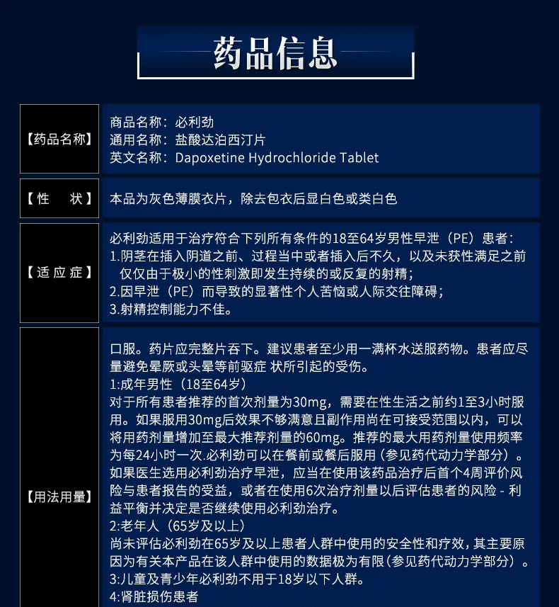 必利劲适用于治疗符合下列所有条件的18岁至64岁男性早泄(PE)患者:·阴茎在插入阴道之前、过程当中或者插入后不久,以及未获性满足之前仅仅由于极小的性刺激即发生持续的或反复的射精;和因早泄(PE)而导致的显著性个人苦恼或人际交往障碍;和射精控制能力不佳。用法用量