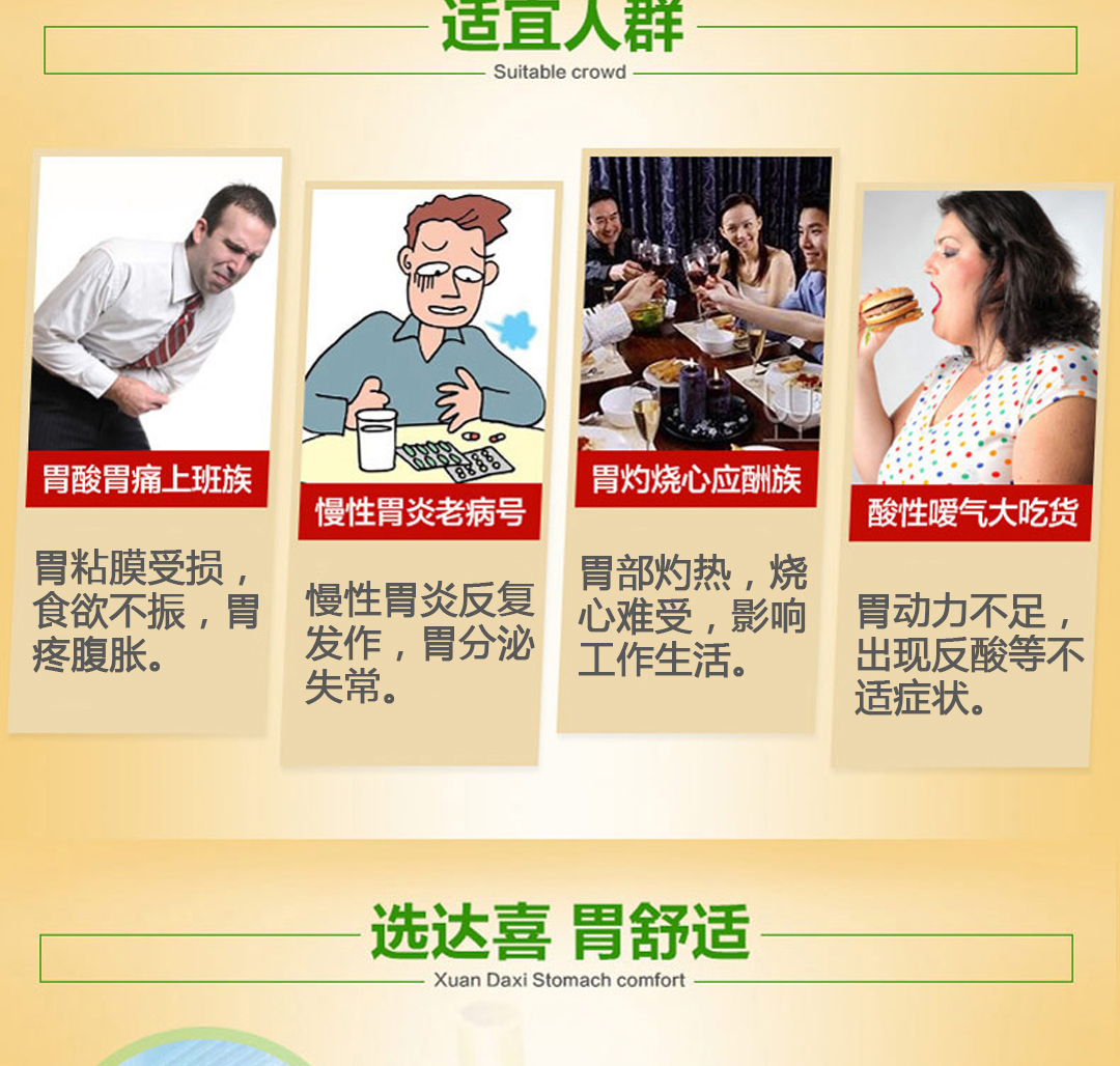 【功能主治】1.慢性胃炎。2.与胃酸有关的胃部不适症状,如胃痛、胃灼热感(烧心)、酸性嗳气、饱胀等。