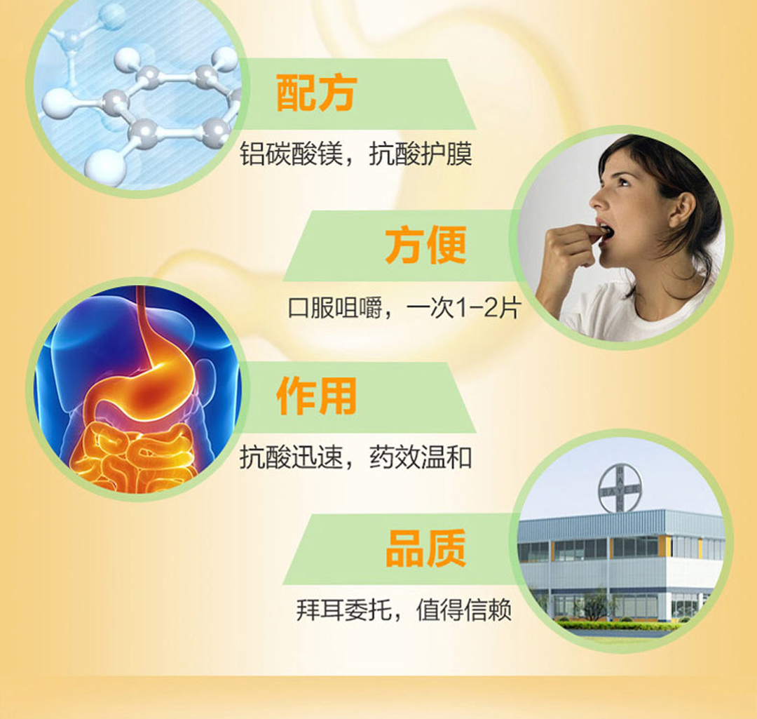 【用法用量】口服(咀嚼后服用)。一次1~2片,一日3次。餐后1~2小时、睡前或胃部不适时服用。