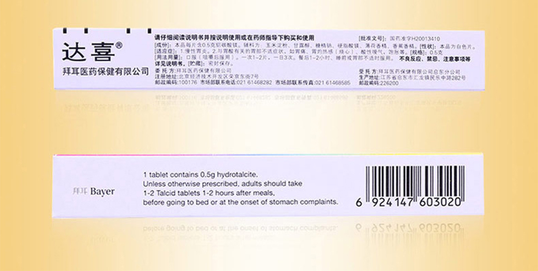 【药品名称】通用名称:铝碳酸镁片 商品名称:达喜 英文名称:Hydrotalcite Tablets 汉语拼音:Lv Tansuanmei Pian