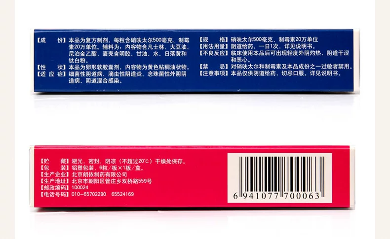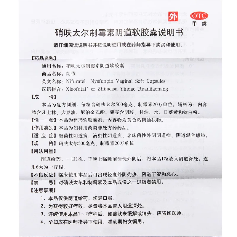 本品为复方制剂,每粒含硝呋太尔500mg,制霉素20万单位。辅料为:内容物含凡士林、大豆油、尼泊金乙酯、囊壳含明胶、甘油、水、日落黄和钛白粉。