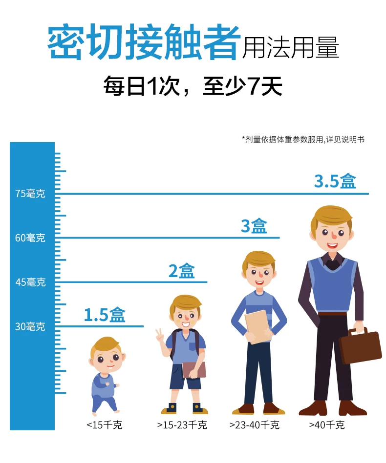 磷酸奥司他韦用于与流感患者密切接触后的流感预防时的推荐口服剂量为75毫克,每日1次,至少7天。同样应在密切接触后2天内开始用药。磷酸奥司他韦用于流感季节时预防流感的推荐剂量为75毫克,每日1次。有数据表明连用药物6周安全有效。服药期间一直具有预防作用。
