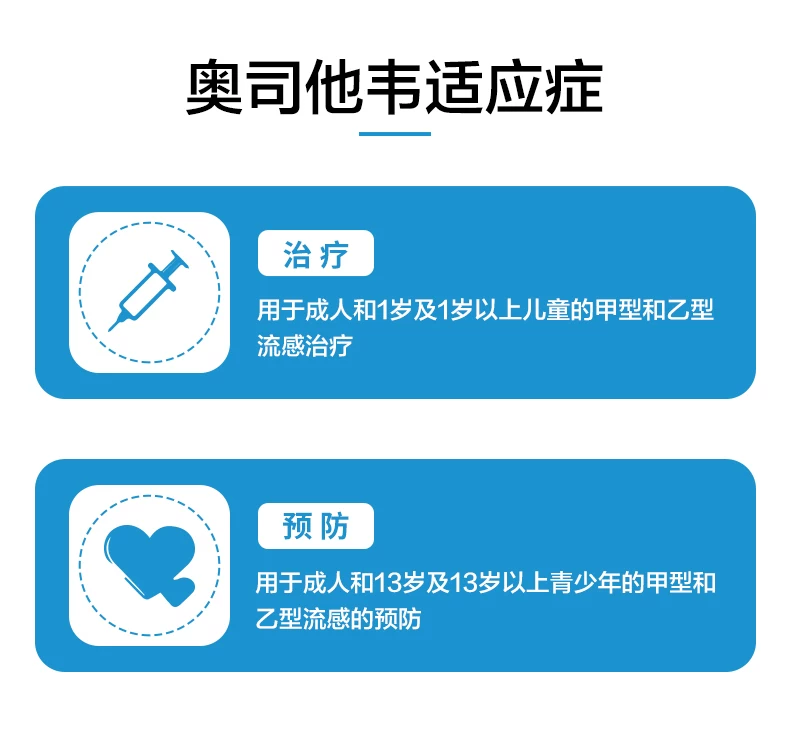 1.用于成人和1岁及1岁以上儿童的甲型和乙型流感治疗(磷酸奥司他韦能够有效治疗甲型和乙型流感,但是乙型流感的临床应用数据尚不多)。