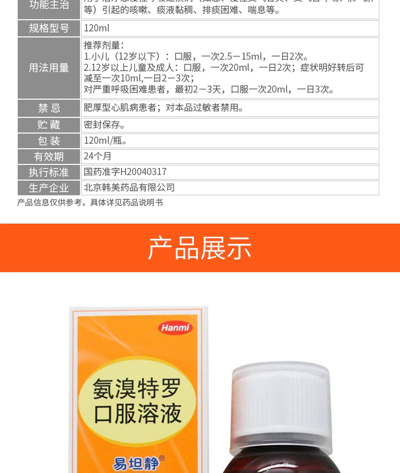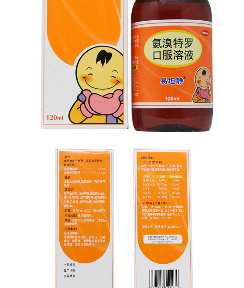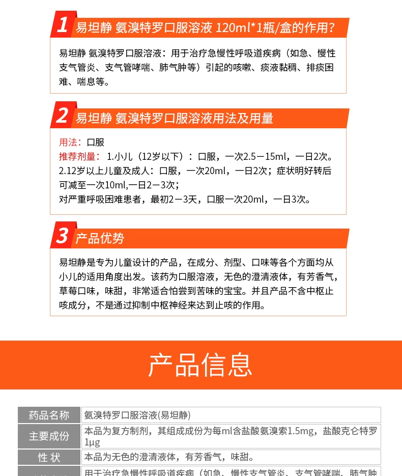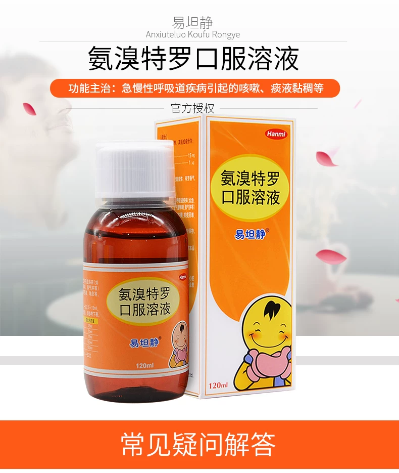 易坦静(氨溴特罗口服液),适应症为用于治疗急、慢性呼吸道疾病(如急、慢性支气管炎、支气管哮喘、 肺气肿等)引起的咳嗽、痰液粘稠、排痰困难、喘息等。