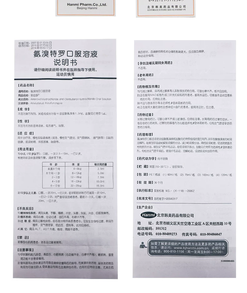 本品为复方制剂,其组成成份为每ml含盐酸氨溴索1.5mg,盐酸克仑特罗1μg。