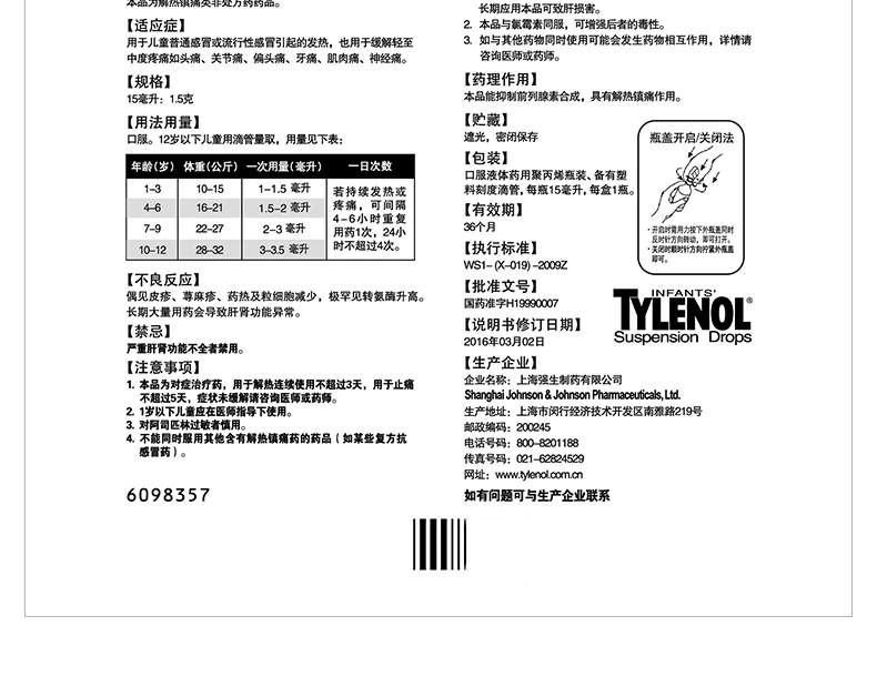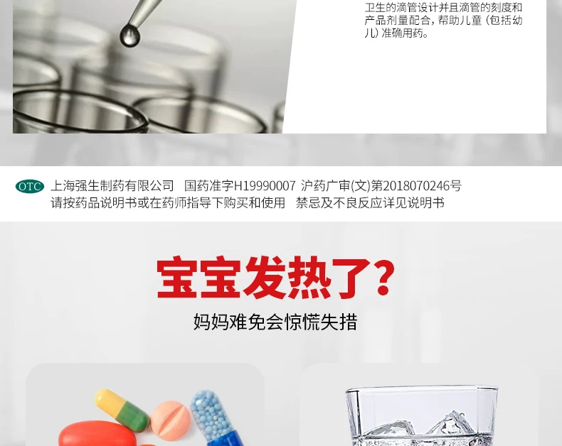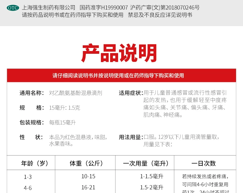 | 用法用量 | 口服。 12岁以下儿童用滴管量取 1~3岁,10~15公斤,一次1~1.5毫升 4~6岁,16~21公斤,一次1.5~2毫升 7~9岁,22~27公斤,一次2~3毫升 10~12岁,28~32公斤,一次3~3.5毫升 一日次数若持续发热或疼痛,可间隔4~6小时重复用药1次,24小时不超过4次。 |