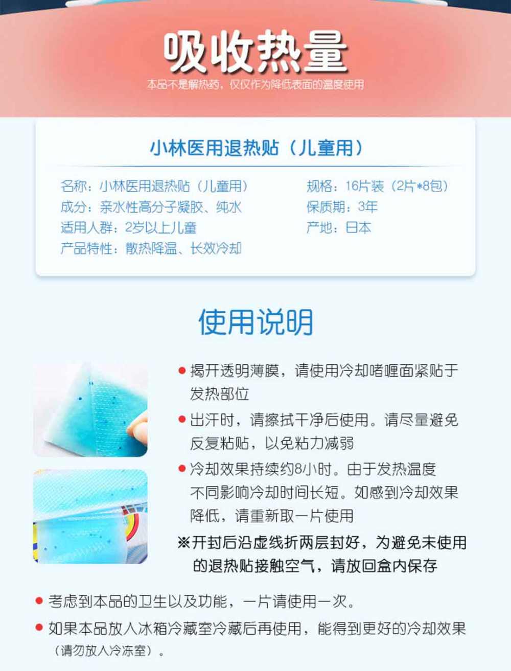 【注意事项】1.皮肤异常(伤口、湿疹、皮炎等)部位以及眼睛请勿使用。 2.儿童,婴儿或身体障碍的人,以及不能自行揭下的情况下,贴在口鼻或放进口中可能会有窒息的危险,请勿必在监护者看护下使用。 3.本品用于辅助降温,非药品。如高烧持续不退,请速到医院诊治。 4.请在医师的指导下使用。