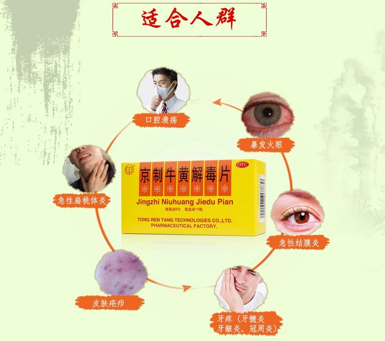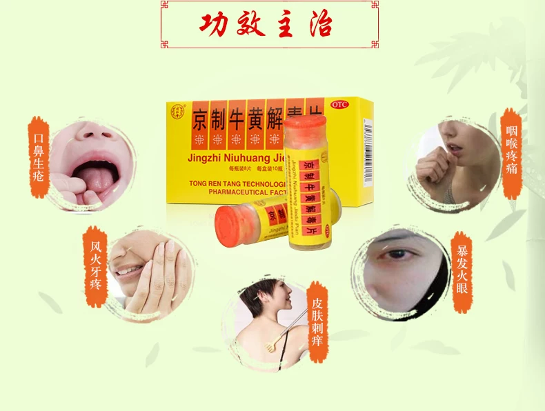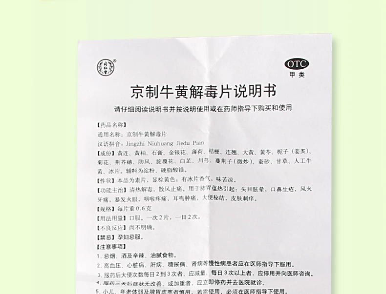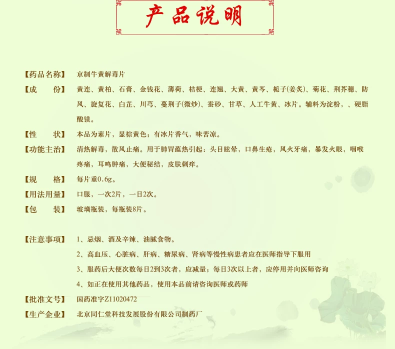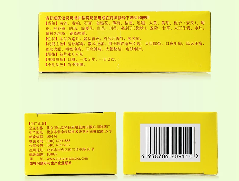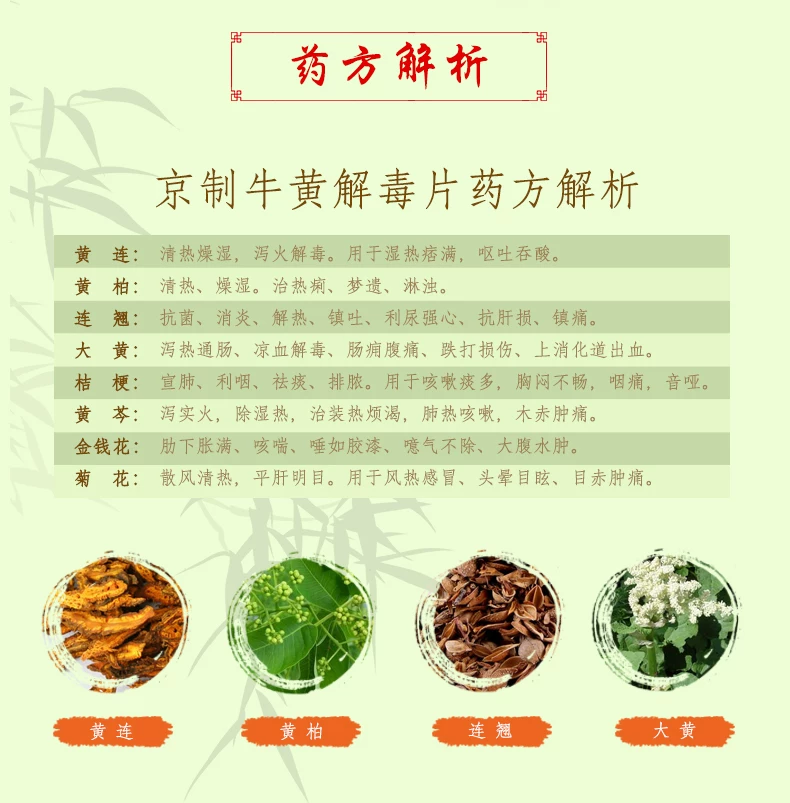 【药品成分】黄连、黄柏、石膏、金银花、薄荷、桔梗、连翘、大黄、黄芩、栀子(姜炙)、菊花、荆芥穗、防风、旋复花、白芷、川芎、蔓荆子(微炒)、蚕砂、甘草、人工牛黄、冰片。辅料为淀粉、硬脂酸镁。