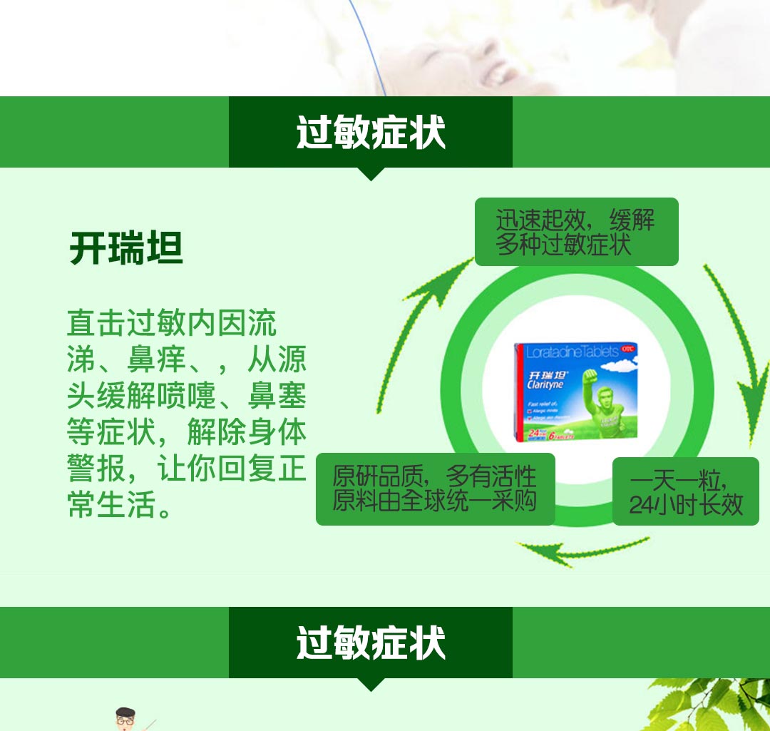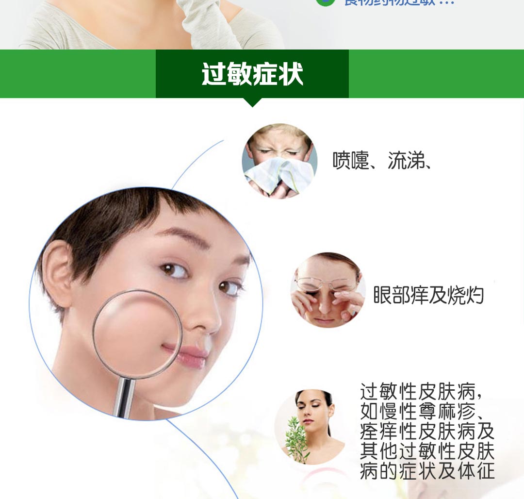 【功能主治】用于缓解过敏性鼻炎有关的症状,如喷嚏、流涕、鼻痒、鼻塞以及眼部痒及烧灼感,口服药物后,鼻和眼部症状及体征得以迅速缓解,亦适用于缓解慢性荨麻疹、瘙痒性皮肤病及其他过敏性皮肤病的症状及体征。