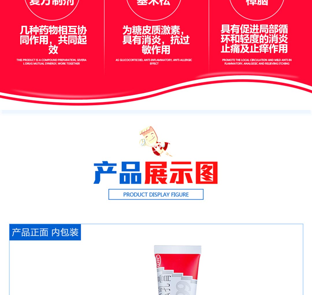 【药品成分】本品为复方制剂,每克含醋酸地塞米松0.75毫克,樟脑10毫克,薄荷脑10毫克。